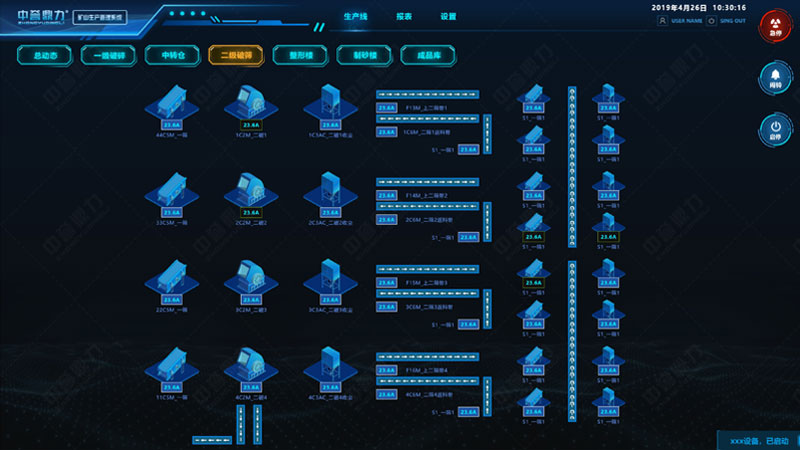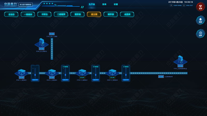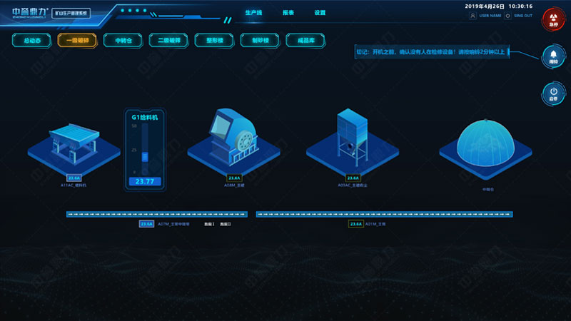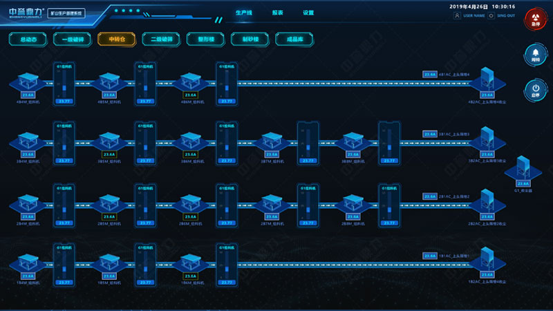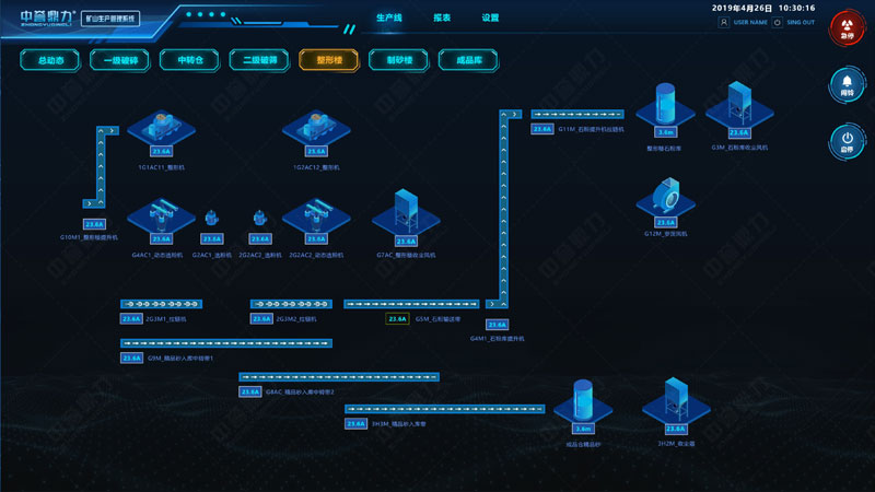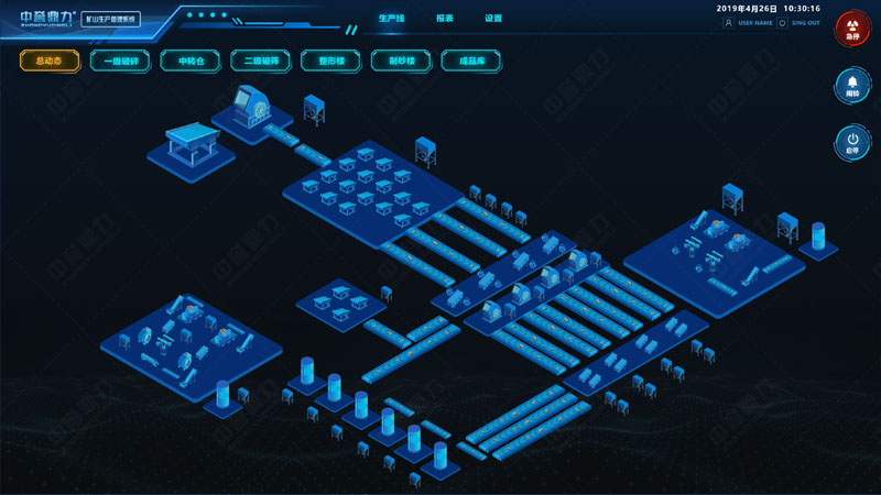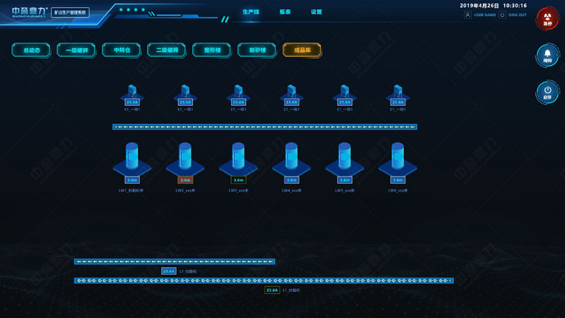 礦山生產(chǎn)管理系統(tǒng)三維形式展現(xiàn)整個(gè)生產(chǎn)線,可遠(yuǎn)程控制砂石骨料線的給料機(jī)、破碎機(jī)、皮帶機(jī)、制砂機(jī)、振動(dòng)篩等各設(shè)備的啟停,通過(guò)傳感裝置感知設(shè)備運(yùn)行狀態(tài)(如設(shè)備溫度、電壓、電流、振頻等數(shù)據(jù)),可監(jiān)測(cè)生產(chǎn)線產(chǎn)量、各儲(chǔ)料倉(cāng)料位高度等信息,自動(dòng)生成報(bào)表,實(shí)現(xiàn)礦山生產(chǎn)環(huán)節(jié)的智能化操控管理及生產(chǎn)決策。