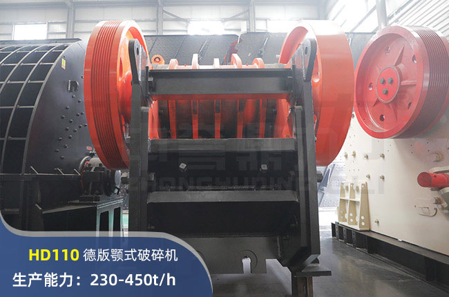 HD110(912)顎式破碎機進料口尺寸850×1100mm,進料粒度750mm,出料大小100-200mm,電機功率6p 132kw,時產可達450噸。