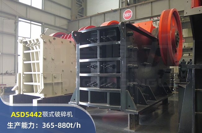 ASD5442顎式破碎機每小時產量365-880噸左右,進料口尺寸1370×1070mm,出料粒度90mm左右,電機功率185kw,屬于產量適中顎式破碎機,適合用在中小型的生產線上。