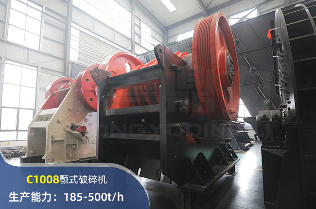 C1008顎式破碎機(jī)時(shí)產(chǎn)量在185-500噸左右,電機(jī)配備的是110kw的,進(jìn)料粒度800mm,出料粒度65mm,屬于中小型顎式破碎機(jī)。