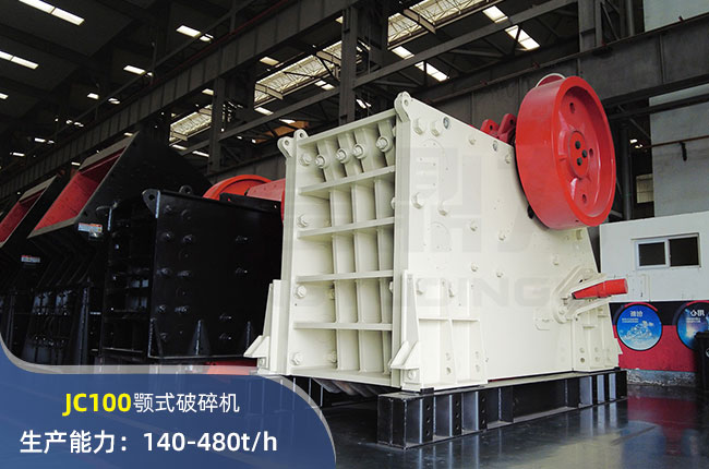 JC100顎式破碎機進料口尺寸1000×760mm,進料粒度≤640mm,出料大小≤70mm,電機功率110kw,時產(chǎn)量480噸左右。
