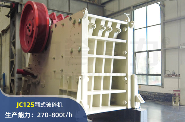 JC125顎式破碎機(jī)進(jìn)料口尺寸1250-950mm,進(jìn)料粒度≤810mm,出料大小≤100mm,電機(jī)功率160kw,時(shí)產(chǎn)量在800噸左右。