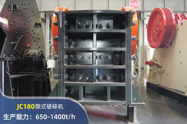 JC180顎式破碎機(jī)進(jìn)料口尺寸1800×1500mm,進(jìn)料粒度≤1280mm,出料大小≤175mm,電機(jī)功率355kw,時(shí)產(chǎn)量在1400噸。