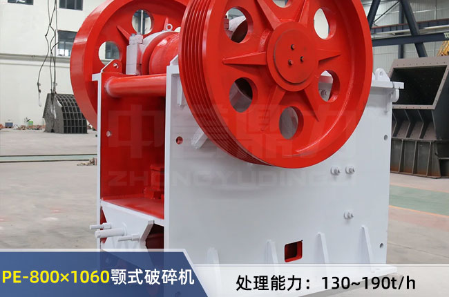 PE-800×1060顎式破碎機以進料口800×1060mm命名,較大進料粒度≤640mm,時處理能力在130-190噸,出料可調范圍在130-190mm,配備的8級110kw的電機,設備總重量是29.8噸。