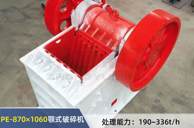 PE-870×1060顎式破碎機進料尺寸是870×1060mm,進料粒度≤660mm,每小時的處理能力在190-336噸,排料口調整范圍200-260mm,電機功率110kw,重31.5噸。