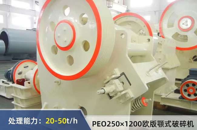 PEO250×1200歐版顎式破碎機進料粒度≤220mm,排料口調節范圍20-40mm,時產量20-50噸,配的是37kw電機,外型長寬高尺寸為1400×2050×1310mm,重量為6噸。
