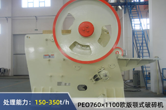 PEO760×1100歐版顎式破碎機進料粒度≤620mm,排料口調節范圍75-200mm,時產量150-350噸,配置電動機功率是100-132Kw,機器重量在24噸左右。