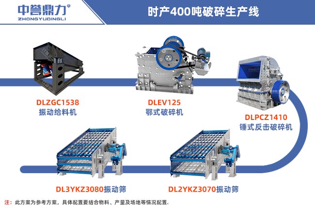 時產400噸砂石生產線反擊破設備配置,根據原料大小情況,針對原料較大的可以配備鄂式破碎機做粗碎加工,整套配置有1538振動給料機+EV125顎式破碎機+DLHCS1523反擊式破碎機+3YKZ3080振動篩,具體配置清單如下: