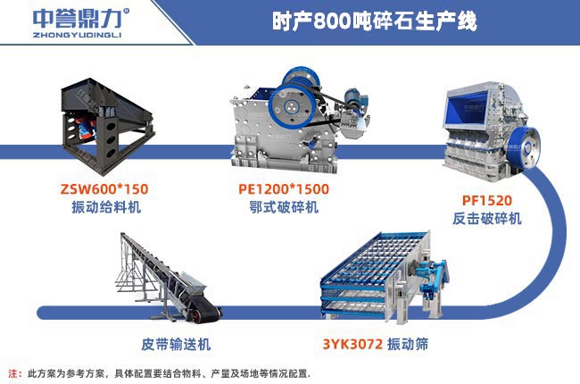 設備配置方案:ZSW600*150振動給料機、PE1200*1500顎式破碎機、PF1520反擊式破碎機、3YK3072振動篩分機、輸送機。
