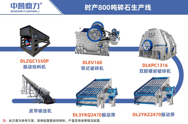 設備配置方案:DLZGC1550P振動給料機、DLEV160顎式破碎機、DLKPC1316雙腔硬巖破、DL2YKZ2470振動篩、3YKQ2470振動篩、輸送機。