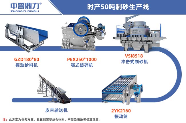 時產50噸制砂生產線需要制砂機、顎破機(重錘破)、反擊破(圓錐破)、制砂機、振動篩、洗砂機、給料機、輸送機等設備。根據破碎原料及成品需求的不同,有軟硬物料工藝之分,干濕制砂工藝之分,投資價格不固定。