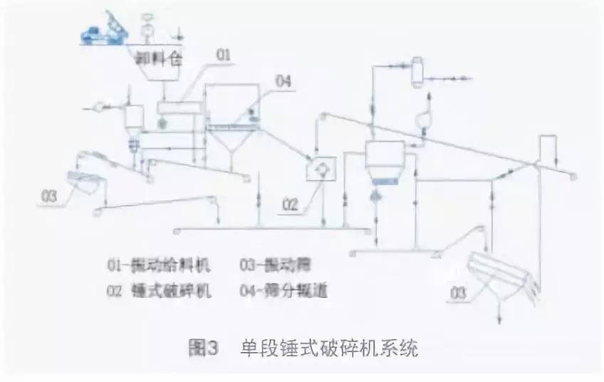 單段錘式破碎機系統由錘式破碎機和篩分系統組成見圖3。