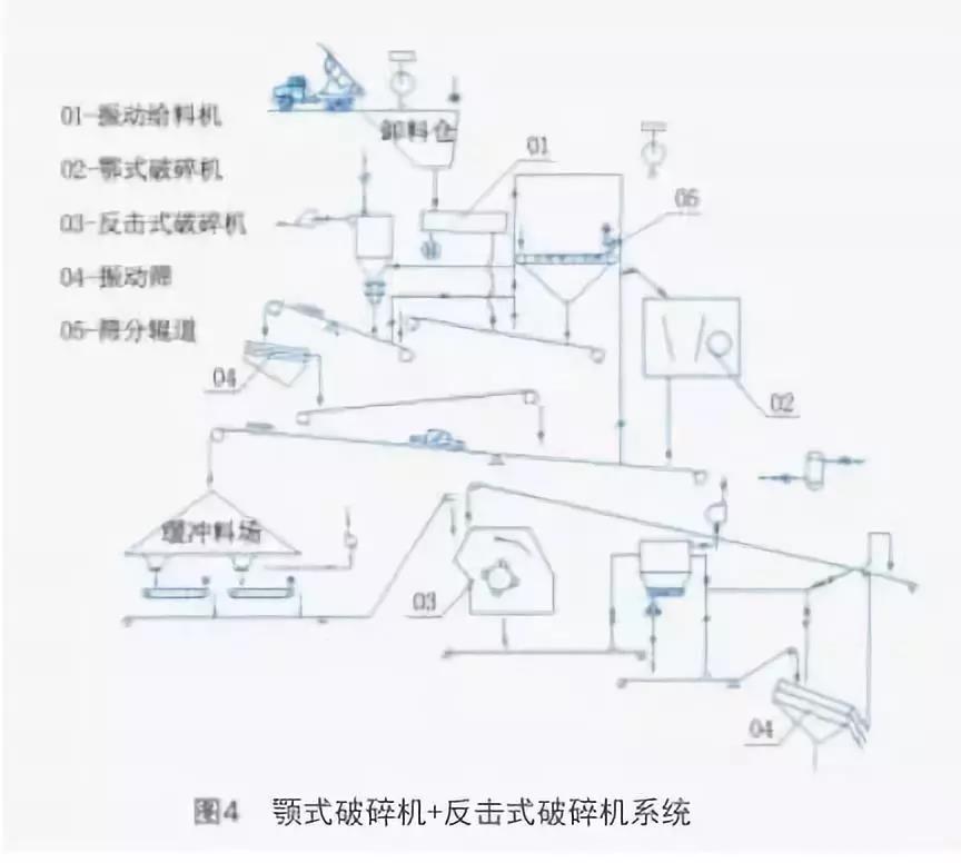 (4)顎式破碎機+反擊式破碎機+立軸破碎機系統