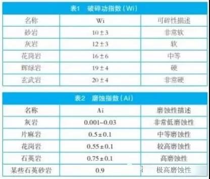 Wi:破碎功指數——物料破碎的難易程度,Ai:磨蝕指數——物料對機件的磨損程度,常見礦石的Wi和Ai見表1、表2。破碎設備對原料的適應范圍見表3、表4。