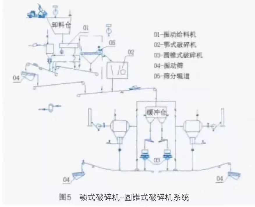 (5)顎式破碎機+圓錐式破碎機+圓錐式破碎機系統