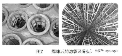 隨著袋式除塵器的普及,袋式除塵器粉塵爆炸事故也呈上升趨勢(shì)。如上海某鋼廠的干熄焦除塵系統(tǒng),由于前部阻火墻制造的問題,造成火星進(jìn)入除塵器內(nèi)從而引起爆炸,將除塵器進(jìn)口管道盲板炸出幾十米遠(yuǎn),除塵器箱體嚴(yán)重變形。又如沈陽某機(jī)制炭廠,由于鋸末在炭化過程中產(chǎn)生大量的焦油和碳?xì)浠衔锏纫兹肌⒁妆镔|(zhì),而且焦油粘在濾袋上隨著時(shí)間推移越積越多,當(dāng)有火星進(jìn)入除塵器后就引起了除塵器爆炸。除塵器爆炸瞬間所產(chǎn)生的能量可使花板嚴(yán)重變形,濾袋爆裂情況見圖7。