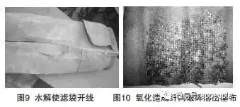纖維氧化是纖維中分子失去(或離解)電子的過程,如PPS纖維,在高溫(150℃)條件下氧分子攻擊分 子中的“S”,并與之結(jié)合。造成PPS纖維變色、變硬、 變脆,強(qiáng)度而破損,嚴(yán)重時(shí)纖網(wǎng)會(huì)破碎而脫離基布 (如圖10)。氧化是濾袋損壞的又一主要因素?寡趸 性能較差的濾料主要有:聚丙烯、聚苯硫醚(PPS)等。