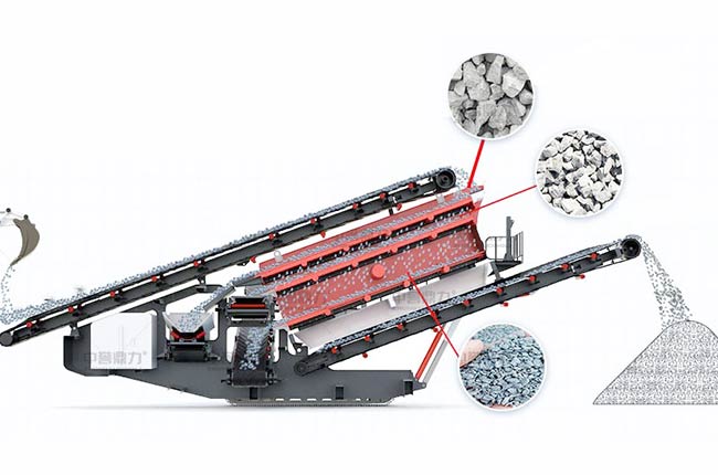 履帶篩分機構造部分包括緩沖料倉、振動篩、皮帶機、檢修走廊、液壓裝置、分料斗、除鐵器、行走履帶等組成。