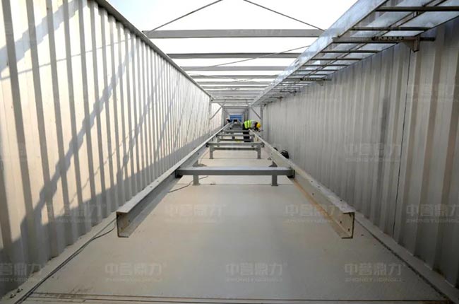 中譽鼎力DL組裝式廊道(砂石運輸廊道),組成部分包括廊道底架、加強撐、波紋側板、底部花紋板、廊道側梁、采光板、廊道上架、支撐位等組成。廊道內還設置有電纜、照明裝置、監控攝像頭固定位置。