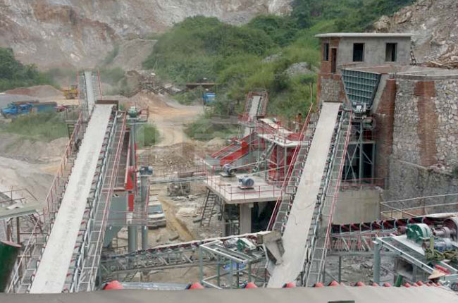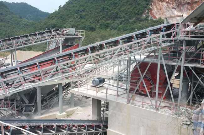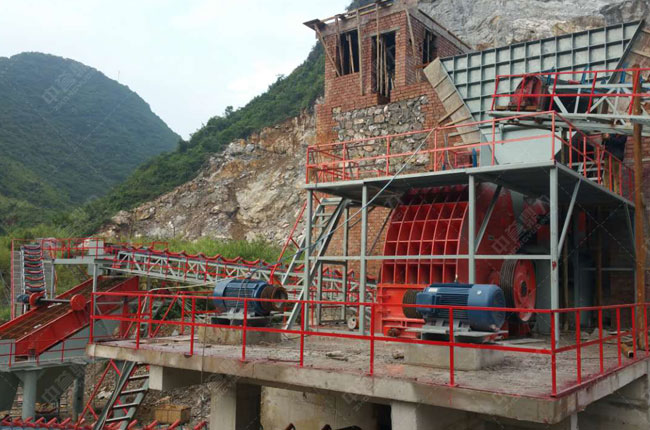 該時產800噸的石灰石破碎生產線是中譽鼎力建造的,采用的是PCZ1615重錘破、PCZ1216錘式破碎機、3YKZ3070振動篩。生產80-200mm、40-80mm兩種規格的石子料。