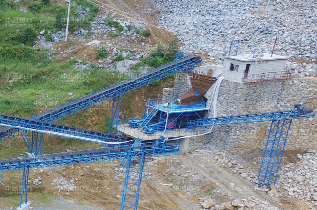 石灰巖物料硬度不高,采用PCZ1512重錘式破碎機,時產量250-320噸,一次破碎成型,不需要二級設備的投資,從PCZ1512重錘式破碎機破碎出來的物料可直接進篩機篩分出3種不同規格的成品石料。此種工藝配置簡單,投資小。