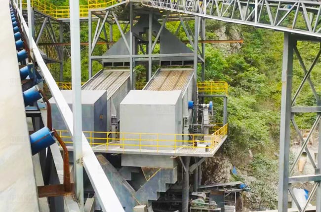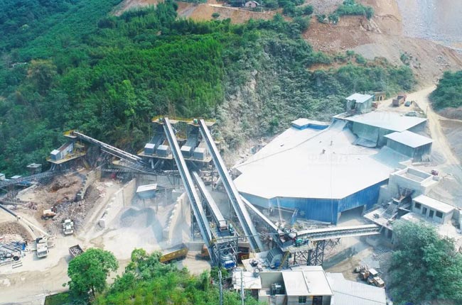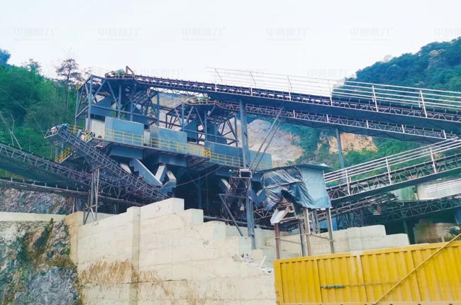 該項目外購原石料由轉(zhuǎn)載機(jī)送入料斗至DLZGC1550P給料機(jī)進(jìn)入DLPCZ1815破碎機(jī)進(jìn)行破碎,再由輸送帶送至DLPCZ1622整形破碎機(jī)進(jìn)一步破碎,細(xì)碎后的石料由輸送帶送進(jìn)振動篩或中轉(zhuǎn)倉,通過振動篩分后,篩出的40-80mm石料進(jìn)入成品倉儲存,0-5mm石料進(jìn)入洗砂機(jī)進(jìn)行洗砂脫水,其余碎石由輸送帶送入振動篩進(jìn)行二次篩分,篩出的40-80mm石料進(jìn)入制砂機(jī)、沖擊破進(jìn)一步破碎后返回振動篩進(jìn)行篩分,二次篩分后得到0-5mm、5-10mm、10-40mm的石料,其中10-40mm的石料進(jìn)入篩分機(jī)進(jìn)行三次篩分,得到10-20mm、20-40mm的石料直接進(jìn)入成品倉。