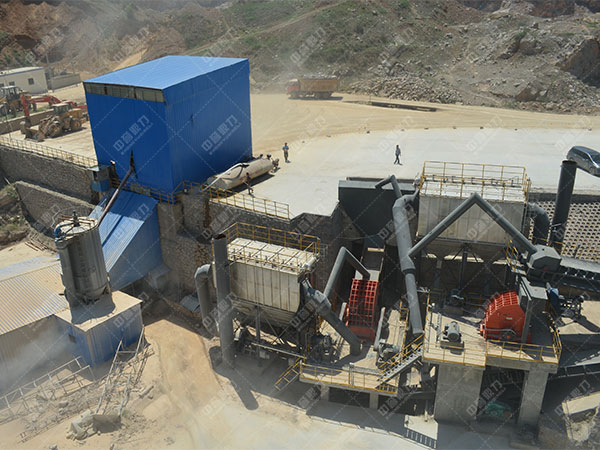 大塊礦石經料堆由振動喂料機均勻送入顎破進行初級粉碎,初級粉碎后的礦石再由傳送設備運輸給圓錐碎石機進行中整型破碎,然后經礦山振動篩篩選分級,大于40毫米的礦石重新返回圓錐碎石機,40毫米以下的礦石由傳送設備送入打砂機進行整形,整形后的成品經由礦山振動篩篩選分級,由傳送設備運輸至成品區。