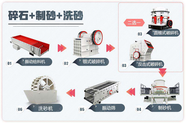 把礦石粉碎成砂石,需要配置初碎、二段破碎、整型破碎機械,再配置喂料、篩選分級、傳送機械,構成一條骨料線,加工環節配置如下: