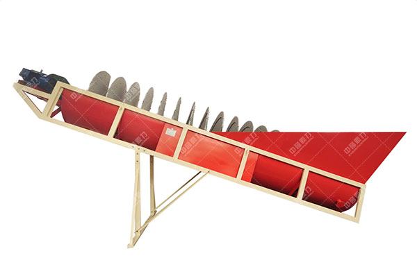 螺旋洗沙機(jī)工作時(shí),電機(jī)通過(guò)V型皮帶、減速機(jī)、齒輪減速后驅(qū)動(dòng)葉輪緩慢操作,砂石有送料槽進(jìn)入洗槽中,在葉輪的驅(qū)動(dòng)下翻滾,并互相碾磨,除去覆蓋砂石表面的臟東西,此時(shí)傷害包覆砂粒的水汽層,以利于脫水;此時(shí)加水,形成強(qiáng)大水流,立即將臟東西及比重小的異物帶走,并從溢出口洗槽排出,完畢清洗影響,干凈的砂石由葉片帶走,后砂石從操作的葉輪倒入出料槽,完畢砂石的清洗影響。