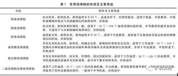 常用的潤滑脂有鈣基潤滑脂、鈉基潤滑脂、鋁基潤滑脂、通用鋰基潤滑脂、壓鋰基潤滑脂和二硫化鉬壓鋰基潤滑脂,其特性及主要用途見表1: