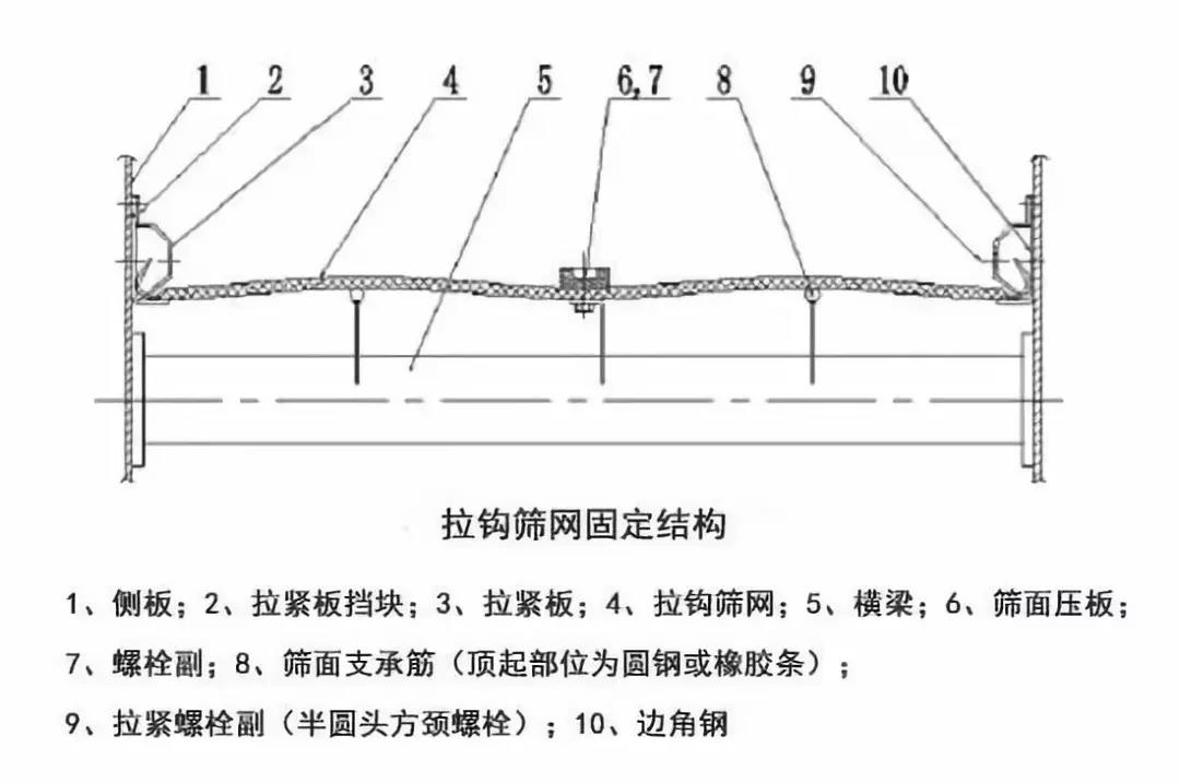 處理方法:對振動篩篩面支撐筋進行改進,增加篩網(wǎng)中間支撐筋的數(shù)量(由3根增加到5根),并且每根都與中間那根一致,具備安裝固定螺栓功能,通過多塊壓板壓緊,篩網(wǎng)固定,無法達到共振。