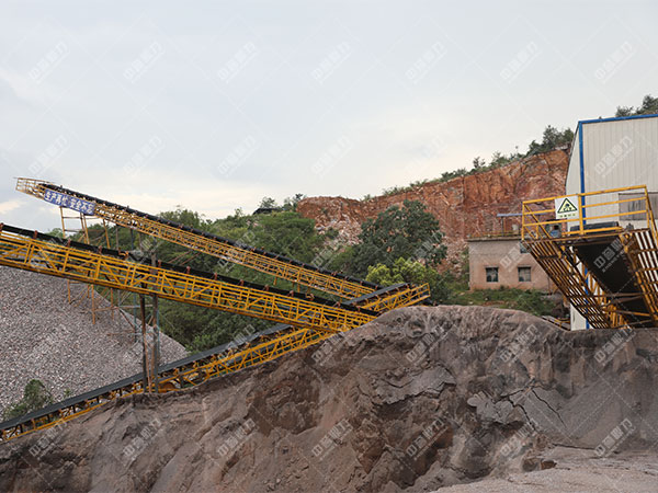 方案一:原料堆+ZSW490x130振動(dòng)送料機(jī)+PCZ1615重錘頭破碎機(jī)+3YK 3072振動(dòng)篩+運(yùn)輸機(jī)(B1200x33米、B800x15米(3臺)、B650x10米、B1000x35米)